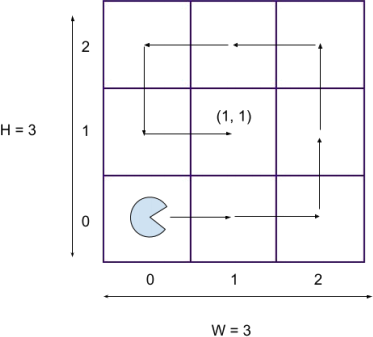 Figure 1: A spiral maze with height 3 and width 3. The number of steps from the origin to the ending point (1, 1) is 8.